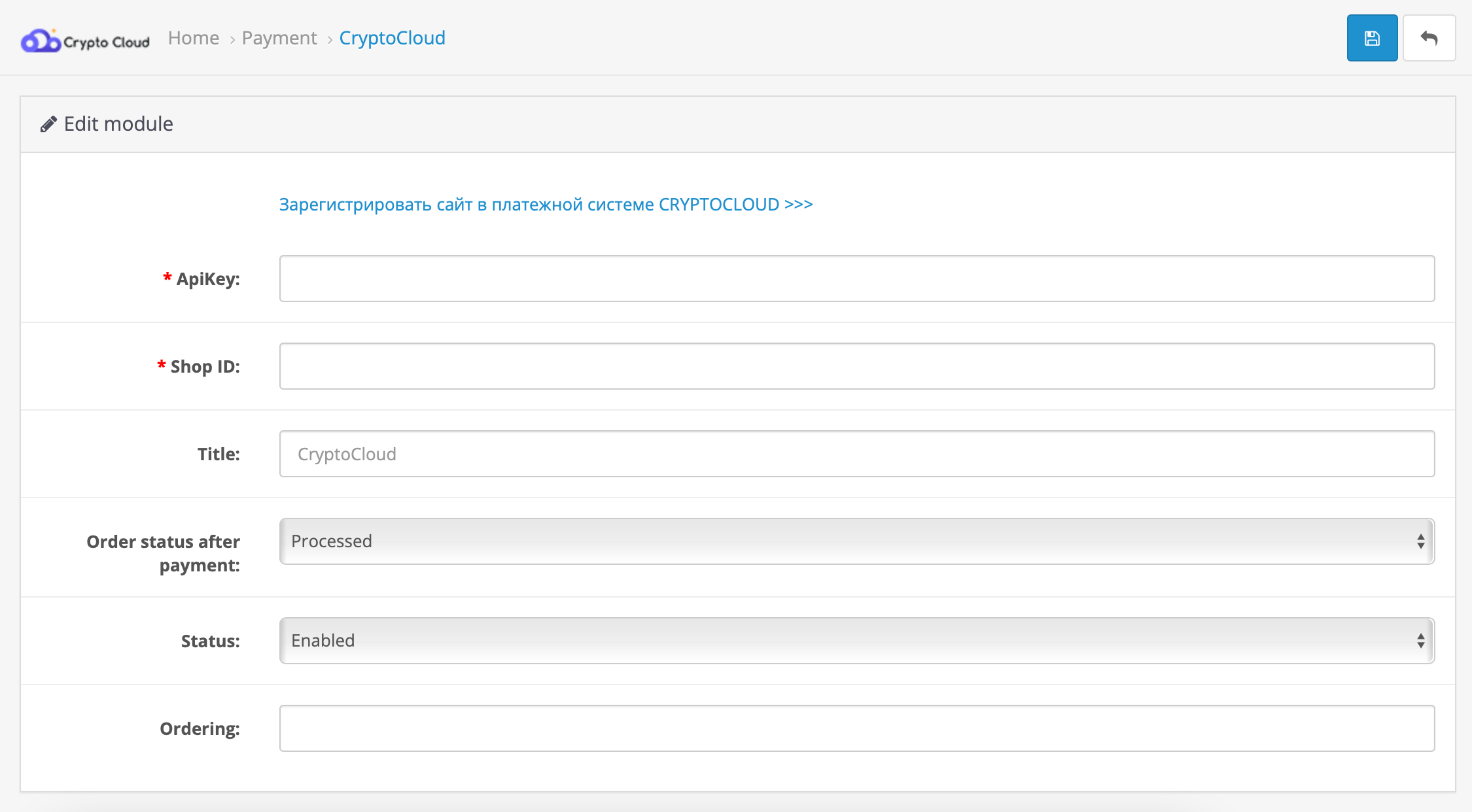 In the OpenCart admin panel go to the «Add-ons» — «Payment» section, activate and customize the payment method «CryptoCloud».