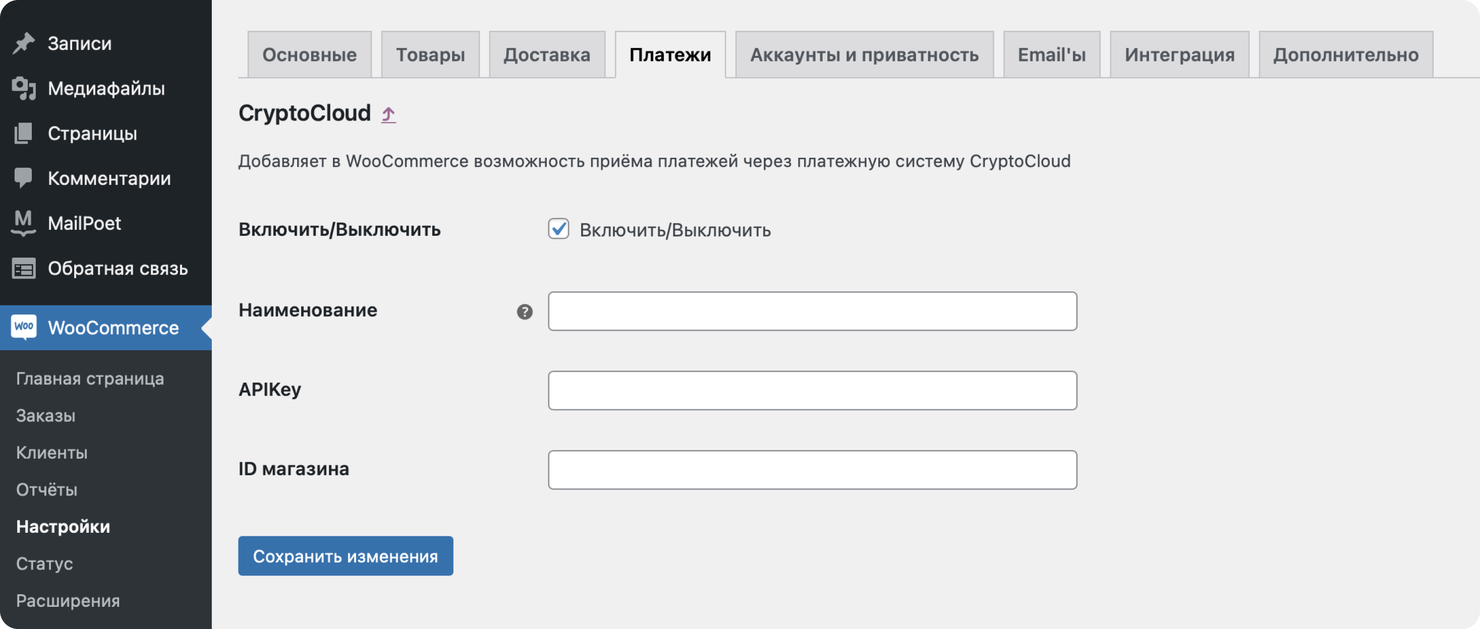 Ниже представлена простая инструкция по интеграции CryptoCloud с WooCommerce: